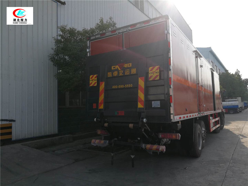 4mm厚的鋼板制作,廂體底部鋪有防靜電膠皮,廂體兩側安裝固定貨物卡槽或臥環,廂體頂部中間位置安裝煙霧報警器,后門及側門安裝防盜報警器,廂體前面鋪靜電膠皮,帶側門,后雙門,廂體顏色根據客戶要求變換,帶兩只滅火器和排氣管防火罩、三角危險品頂燈,其余標配。